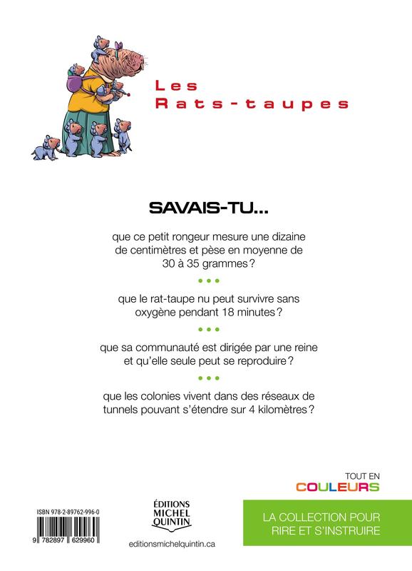 Savais-tu… que ce petit rongeur mesure une dizaine de centimètres et pèse en moyenne de 30 à 35 grammes? que le rat-taupe nu peut survivre sans oxygène pendant 18 minutes? que sa communauté est dirigée par une reine et qu’elle seule peut se reproduire? que les colonies vivent dans des réseaux de tunnels pouvant s’étendre sur 4 kilomètres? ...