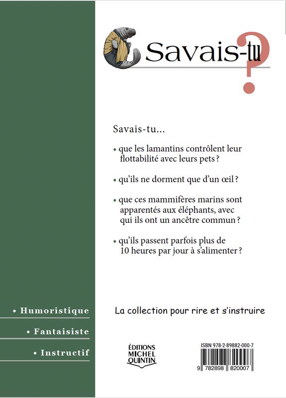 Savais-tu… que les lamantins contrôlent leur flottabilité avec leurs pets? qu’ils ne dorment que d’un œil? que ces mammifères marins sont apparentés aux éléphants, avec qui ils ont un ancêtre commun? qu’ils passent parfois plus de 10 heures par jour à s’alimenter? La collection pour rire et s’instruire.