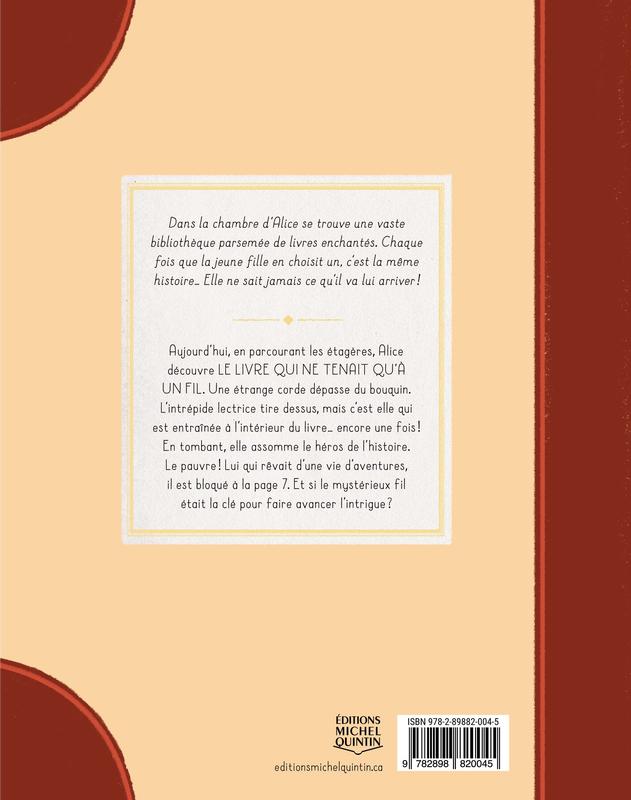 Aujourd hui, en parcourant les étagères, Alice découvre LE LIVRE QUI NE TENAIT QU'A UN FIL. Une étrange corde dépasse du bouquin. L'intrépide lectrice tire dessus, mais c'est elle qui est entraînée à l'intérieur du livre... encore une fois! En tombant, elle assomme le héros de l'histoire. Le pauvre! Lui qui rêvait d'une vie d'aventures, il est bloqué à la page 7. Et si le mystérieux fil était la clé pour faire avancer l'intrigue?