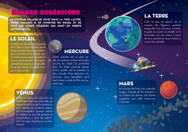 Que dirais-tu de vivre l'aventure la plus formidable de ton existence? Les dragouilles t'invitent à les suivre hors des frontières terrestres, jusque dans l'espace! Avec elles, découvre la Station spatiale internationale et fabrique ta propre fusée. Dessine des aurores boréales et détermine si tu as ce qu'il faut pour devenir astronaute. Résous le mystère des tomates spatiales et réponds à la question : l'espace a-t-il une odeur?